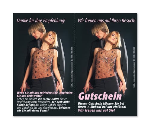 Empfehlungskarten Kundenakquise Kunden gewinnen FA86 Mode Modegeschäft diverse Modeboutique Boutique Fashion Jeans Modegutschein Bekleidung Textilwaren