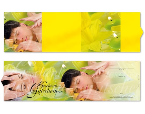 Geschenkgutschein zum Falten, wird mit einer Stecklasche verschlossen.